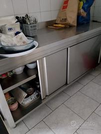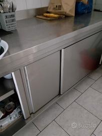 TAVOLO ARMADIATO PROFESSIONALE IN ACCIAIO INOX - ANTE SCORREVOLI Descrizione: Lunghezza 180 Profond.70 h 85 Vendesi tavolo armadiato professionale interamente realizzato in acciaio inox di alta qualità. Un elemento indispensabile per cucine di ristoranti, pizzerie, laboratori di pasticceria o gastronomie che necessitano di un piano di lavoro solido e di uno spazio di stoccaggio igienico e ordinato. Caratteristiche principali: Piano di lavoro rinforzato: Ampia superficie in acciaio inox, ideale per la preparazione degli alimenti. Alzatina posteriore: Bordo rialzato per evitare la caduta di cibo o liquidi dietro il mobile e facilitare la pulizia delle pareti. Ante scorrevoli: Sistema di chiusura con ante scorrevoli (salvaspazio), ideale anche per ambienti con passaggi stretti. Ripiano interno: Dotato di ripiano intermedio per raddoppiare la capacità di stoccaggio. Piedini regolabili: Gambe in acciaio con piedini regolabili per livellare perfettamente il mobile su ogni pavimento. Stato: Il mobile è usato ma in ottime condizioni strutturali. L'acciaio inox permette una sanificazione profonda (normativa HACCP).