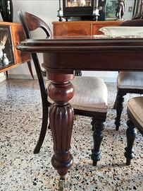 Foto 1 e 2: antico tavolo vittoriano con ruote in ottone, misura 145x105 cm con allunga di altri 40 cm in modo da poter sedere comodamente 8 persone, il tavolo è corredato da 4 sedie appena ritapezzate con stoffa dell'epoca: 1000 euro; foto 3 tavolo napoletano Luigi Filippo fisso in noce nazionale, misura 167x87 più un allunga laterale che fa arrivare il tavolo a 240 cm: prezzo 180 euro Foto 4 tavolino in noce, ottogonale da salotto, misura altezza 65 cm, diametro 60 cm: prezzo 60 euro; Foto 5 antico armadio in noce nazionale, misura: larghezza 176 cm, profondità 53 cm, altezza 232 cm, prezzo 100 euro; Foto 6 antichissimo letto una piazza e mezzo in noce nazionale, prezzo 100 euro. Vi invito a guardare anche gli altri annunci che ho sul sito: se siete intenzionati a visionare o per qualsiasi informazione non inviate mail, ma contattate al 3931170226