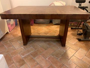 Tavolo art decó 150 x 90, alto 80 cm. È provvisto di allunghi di 40 cm. ciascuno. Aperto completamente diventa quindi 230 cm. Il top non è perfetto in quanto lo abbiamo usato come tavolo da taverna e lo abbiamo sempre lasciato con le sue imperfezioni sul pianale. Volendolo perfetto, è da riverniciare. Solo ritiro, no spedizione.