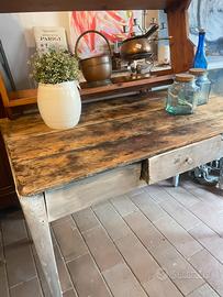 Tavolo in arte povera toscano con base decapata e anticata e il sopra formato da tavole in abete cerate legno naturale. Misura 113x65x80 cm
