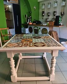 Vendo tavolo artigianale in legno con piano decorato a mano in maioliche dai motivi mediterranei, stile siciliano/ispirazione vintage.