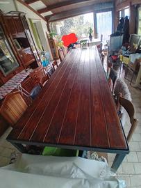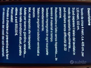 Tavolo di grandi dimensioni e grande robustezza. Dimensioni: 404 cm × 110 cm (oltre 4 metri × un metro e dieci cm). Telaio: angolari e tubolari in ferro, ecc... Verniciato a spruzzo. Tavolato/top: perline e tavole levigate, smussate e tenute unite con altre tavole da carpenteria edile, impregnate abbondantemente. Tavolo mai, mai esposto alle intemperie. Prezzo (euro) non trattabile: 500,00 €. Vi sembra troppo? Se riuscite a trovare i massicci materiali a buon mercato ed avere anche le competenze per realizzarlo in proprio o autonomamente fate pure! Il tavolo in oggetto può ospitare ben 18/20 persone, piuttosto comodamente e dopo che si sono ubriacate possono pure tranquillamente salirci e scatenarsi a ballare...... Il tavolo è stato usato raramente ed ora ormai solo per reggere decine di sacchi di pellets...... Nonostante la robustezza e la mole si può tranquillamente spostare! Il tavolato e solo appoggiato nelle guide/angolari. E' solo per intenditori! In alternativa potete ripiegare sul truciolare che trovate tranquillamente in commercio e che comunque non vi verrà regalato...... Grazie mille. Preferibilmente, inizialmente, contatti Whatsapp al numero: 337891726. Buona vita. Marcellino.