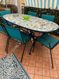 Vendo per motivi di spazio tavolo 180x90 artigianale con telaio in ferro battuto e ripiano in cermaica vietrese, comprensivo di n.6 sedie come da foto