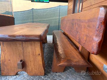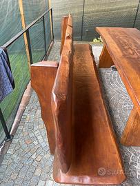 Tavolo artigianale in legno di cedro con panche tutto costruito artigianalmente , davvero bello e molto molto pesante , sparo ma siamo tra tutto vicino ai 400kg , la lunghezza del tavolo è di circa 3 mt largo dagli 83/90 cm , altezza tavolo cm 80 , le panche sono lunghe sempre 3 mt circa , la seduta è di circa 60 cm , altezza delle spalle dove è fissato lo schienale sono di circa 113cm , mentre gli schienali sono alti circa 58 cm , lo vendo perche dove è posizionato è troppo sacrificato , il prezzo non è assolutamente trattabile e il trasporto o ritiro a carico dell acquirente , quel prezzo lo vale solo il legname