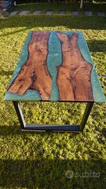 Tavolo artigianale in noce massello con inserto in resina verde petrolio.