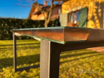 La base è composta da gambe in ferro artigianali Made in Italy, realizzate in tubolare 80×40 mm con rinforzi orizzontali per garantire rigidità strutturale e stabilità anche su piani importanti.