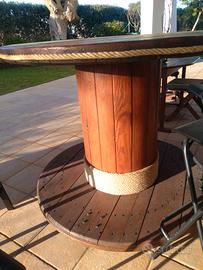 Rotondo, interamente realizzato e dipinto a mano (rosa dei venti, corda nautica). Integra piccole ruote per facilitarne lo spostamento.