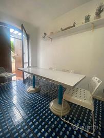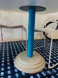 Gambe in metallo verniciate in azzurro e base in cemento grigio.