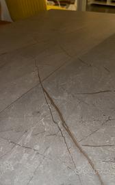 Il tavolo presenta un top effetto pietra / ceramica dalle eleganti venature naturali grigio-calde, estremamente attuale e raffinato, perfetto per ambienti moderni, contemporanei o minimal.