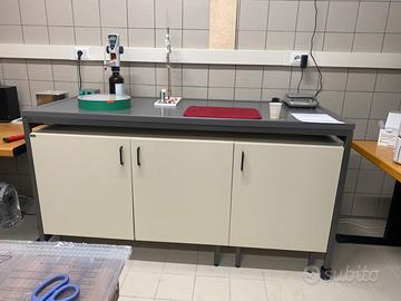 Tavolo laboratorio con piano in ceramica struttura in metallo dotato di mobile con ripiani. Dimensioni 180x75 x 95h . Prezzo non trattabile non spedisco