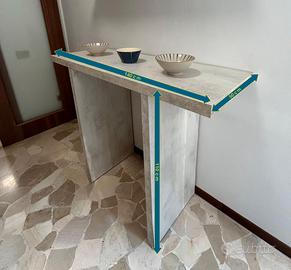 In vendita tavolo bancone dal design semplice e moderno, realizzato con pannelli in finitura chiara effetto cemento. Il mobile è ideale come piano d’appoggio in ingresso, soggiorno o cucina.