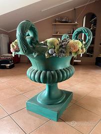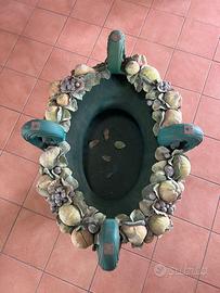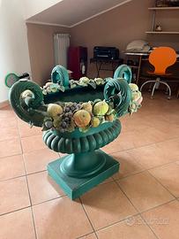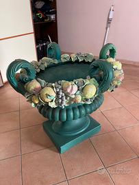 La base è un grande vaso in ceramica verde, decorato con frutta e foglie modellate e dipinte a mano: uva, fichi, mele, limoni... ogni elemento racconta una storia di gusto e tradizione. Il piano in vetro (incluso) è di forma ovalizzata, misura 250x110 cm, con estremità rettangolari; presenta qualche segno di utilizzo, come è naturale nel tempo.