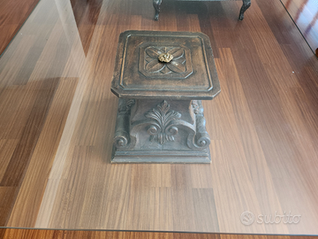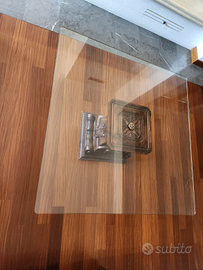 Tavolo basso da salotto con piano in cristallo e basamento in legno massello intarsiato. In ottime condizioni generali, tranne una piccola scalfitura sul vetro come si vede sulla foto. Dimensioni cm.: 115x115x43h.