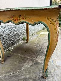 Tavolino basso da salotto / coffee table antico vintage in legno dipinto in ste veneziano Buone condizioni, struttura solida. La pittura é saltata in diversi punti. Ritiro a mano su genova Dimensioni 65 x 50 cm altezza 45 cm
