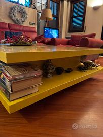 Tavolo basso da soggiorno in legno massello, colore giallo caldo/ocra, ideale come tavolo conviviale centrale per un salotto di ampie dimensioni.