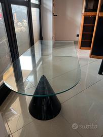 tavolo basso in cristallo curvo con piede a forma di cono nero lucido.