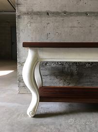 Tavolo basso interamente realizzato in legno massello di noce canaletto con gambe lavorate a mano e verniciate con colori ad acqua.