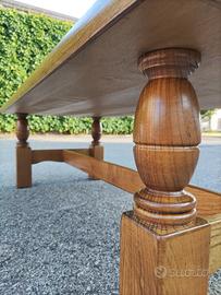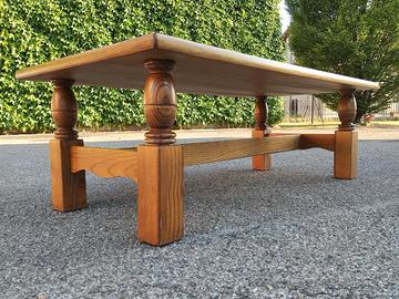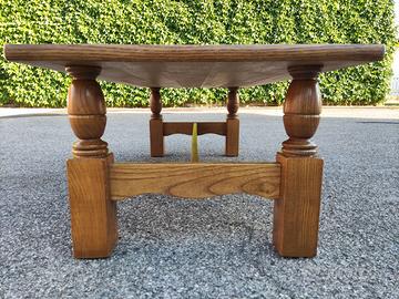 Tavolo basso da mm 1400x700xh455 realizzato in legno di frassino tinto noce. Piano di spessore 30mm in truciolare alta densità impiallacciato su entrambe le facce e bordato con cornice bombata di frassino. Peso complessivo circa 27 Kg. Le gambe sono realizzate con quadrotti da 80x80 mm torniti da metà altezza in su. Tavolo realizzato alla fine degli anni 70, stoccato in casa, ma in realtà mai utilizzato, in condizioni pari al nuovo.