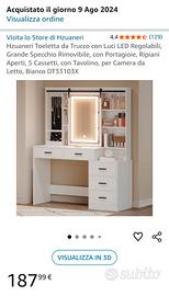 Tavolo Beauty bianco comprato due anni fa su Amazon a 184€. Letteralmente come nuovo, completo di: - specchio scorrevole con luci led a 3 intensità, - reparto collane, - reparto orecchini/anelli, - due cassetti ampi, - ripiani esterni 6/8, - altri 3 ripiani interni dietro lo specchio, per un totale di ben 11 ripiani!!! Tenuto in modo maniacale, davvero come nuovo! Dimensioni 150x120x40cm. Vendo per trasloco e poco spazio. Possibile consegna (in Bari).