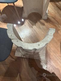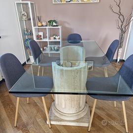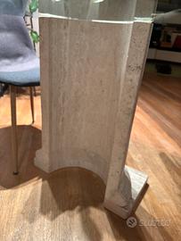 Vendo splendido tavolo da pranzo di design postmoderno, originale anni 90 caratterizzato da un'estetica scultorea e materiali di pregio. Base in Travertino e Vetro Temperato Il tavolo è composto da: • Base: Una maestosa colonna scanalata in vero Travertino, pietra naturale porosa dal fascino senza tempo. La base è solida, pesante e garantisce una stabilità assoluta. • Piano: Vetro temperato trasparente di alto spessore, con bordi rifiniti, che permette di ammirare la lavorazione della pietra sottostante. Condizioni: II tavolo è in ottime condizioni vintage. La pietra non presenta crepe o macchie significative; il vetro è integro e presenta solo i normali segni del tempo (micro-graffi superficiali quasi invisibili). 1.80 lunghezza 90 cm larghezza Altezza 75 cm