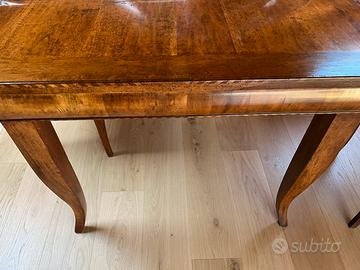 Tavolo da pranzo in noce nazionale, lavorazione artigianale, con intarsio centrale, intarsi su tutto il perimetro, gambe a sciabola, misura 200x100