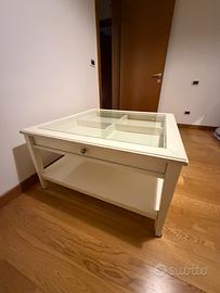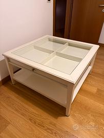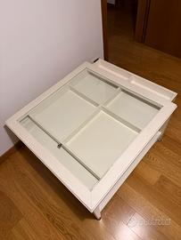 Tavolo bianco con piano in vetro e cassetto con 4 scomparti. Il cassetto è scorrevole da entrambi i lati. Adatto come tavolino o tavolo multiuso. Dimensioni: H 51 × L 92,5 cm