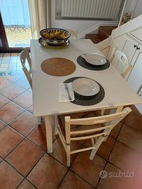 Tavolo con base in marmo bianco con 4 sedie in legno. Misure: Lunghezza 130 x larghezza 85 x altezza 78