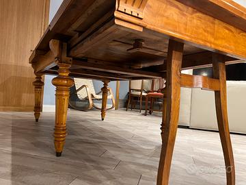 Tavolo da pranzo originale Biedermeier in legno massello allungabile fino a tre volte (sei tavole) e per una capienza di 20-24 persone.
