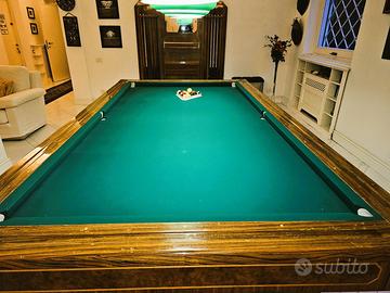 Biliardo MBM a 4 basi vuote lavorate, rivestimento in Noce, Zebrano e Acero, maschere raccogli biglia in ottone. Il tavolo è termo riscaldato.