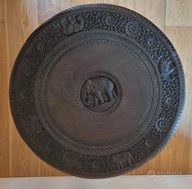 Un raffinato tavolo a forma di elefante birmano, pesantemente intagliato, con piano rotondo sorretto da quattro elefanti con zanne di avorio finto in legno. Circa 1880, pezzo di arredamento d'interni altamente collezionabile. Dimensioni in pollici (CM): Larghezza x Profondità x Altezza 19 (48) x 19 (48) x 22 (56). Buone condizioni generali, ma mancano alcune zanne. Nessuna spedizione, solo ritiro di persona