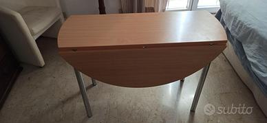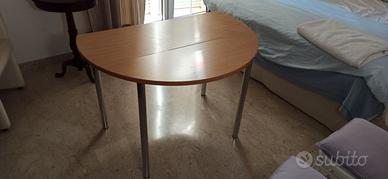 tavolo tondo diametro cm 115 circa con due ante a ribalta. Gambe in acciaio cromato e piano in laminato faggio.