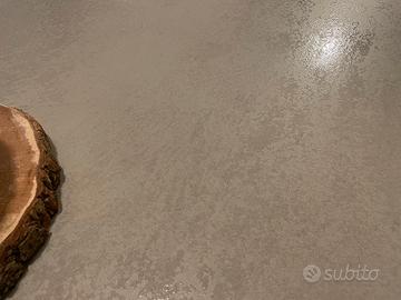 Piano in Superceramica color sabbia, allunga in laminato, struttura in acciaio con piedi laterali, stesso colore.