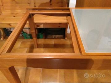 tavolo Caligaris 120x90( allungabile a 240),piano in vetro temprato color acquamarina, in legno massello ciliegio, gambe smontabili, manca il vetro della parte allungabile, che sta sotto il piano.