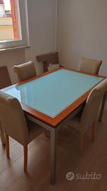 Tavolo Calligaris allungabile in vetro e legno , con piedi in acciaio , adatto ad ogni ambiente grazie ai suoi colori neutro. Misura 130 cm di lunghezza e 85 cm di larghezza , aperto con tavola interna misura 160 cm.