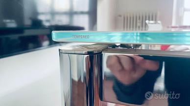 tavolo con ripiano in vetro temperato bianco e gambe in acciaio cromato , marca Calligaris