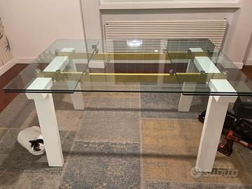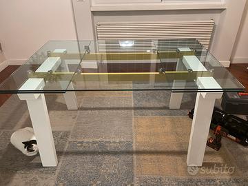 Tavolo Calligaris Levante allungabile. Misure: lunghezza 140 (allungabile 180/220) - profondità 90, altezza 76. Le gambe sono in legno bianco, il piano in vetro temprato trasparente e la struttura metallica in finitura color senape. Consegna al domicilio già smontato.