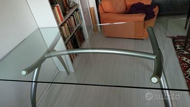 Gli appoggi del piano in cristallo introducono un’innovazione formale inedita: un anello di gomma siliconica trasparente che, fungendo da congiunzione tra il tubo in metallo e il terminale bombato, si integra perfettamente con il disegno della struttura. Questa soluzione nasce con il progetto del tavolo DIABLO e oggi troviamo molti modelli che imitano la stessa soluzione per evitare supporti instabili o sgradevoli ventose.