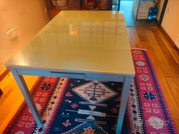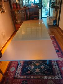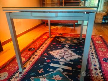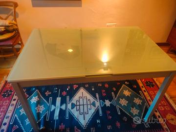 Tavolo in vetro satinato e metallo, allungabile. Misure da chiuso:120 x 80.Misure da allungato parziale 170, allungato totale 220. Altezza da terra 75 cm. Acquistato in noto negozio design di Grosseto