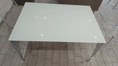 Vendo tavolo Cantori, modello Malaga, 130×90 cm allungabile, con piano in vetro e gambe in acciaio cromato, + 2 allunghe + 4 sedie in omaggio.