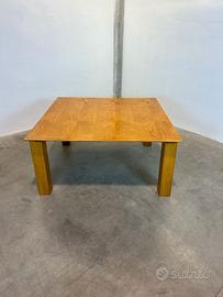 Questo formato quadrato dona al tavolo una forte personalità: non è solo un piano d’appoggio, ma un vero fulcro visivo della stanza, capace di organizzare lo spazio intorno a sé con autorità discreta. Ideale per 8 persone in configurazione simmetrica o per ambienti living/dining open space, offre una superficie generosa senza appesantire l’ambiente, grazie alla sua geometria pulita e alla leggerezza apparente.Il materiale scelto per questo esemplare è legno naturale bellissimo, probabilmente rovere di Slavonia o essenza chiara con venature pronunciate e calde, finite con olio o vernice trasparente che esalta la matericità viva del legno. La superficie rivela nodi, sfumature naturali e una texture tattile irresistibile: un legno che respira, invecchia con grazia e acquista carattere con il tempo, trasformando ogni segno d’uso in patina nobile. La base, tipicamente composta da gambe squadrate con smusso superiore e telaio di connessione in metallo verniciato (spesso nero opaco per contrasto), crea un dialogo perfetto tra solidità e raffinatezza. Le gambe profilate con precisione geometrica conferiscono al tavolo un aspetto quasi scultoreo, architettonico: da lontano sembra s
