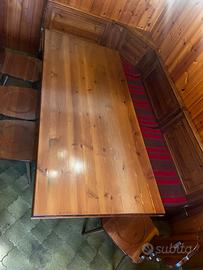 Vendo set tavolo con sedie e cassapanca ad angolo tutto in legno massello, mobili usati ma in ottimo stato. Tavolo cm 195x98 alto 78
