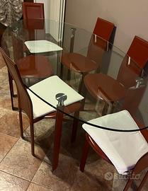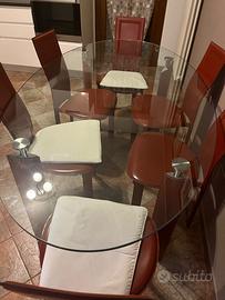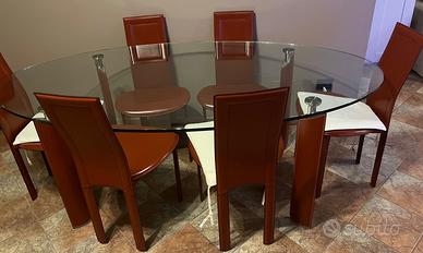 Tavolo ovale in cristallo ( spessore di ben 1,5cm) , retto da 4 gambe rivestite in pelle bordeaux , lungo 2 mt x 1,10 mt più 6 sedie modello Lara completamene rivestite in pelle bordeaux , il tutto in ottimo stato.