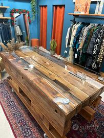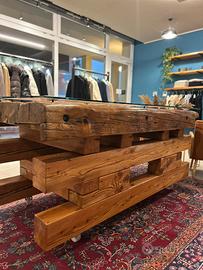Tavolo/isola centrale realizzato artigianalmente con travi in legno di larice massello di recupero, trattate con finitura protettiva che valorizza venature e nodi naturali.