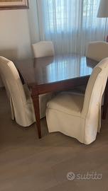 Per esigenze di spazio, SVENDO Tavolo classico con intarsi, misure 110*110, allungabile, che presenta solo una piccola ammaccatura come da foto. Il tavolo è accompagnato da 4 sedie vestite, completamente sfoderabili e fodere lavabili in lavatrice.
