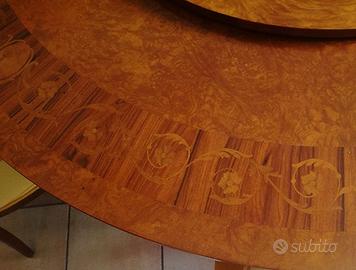 Ampia piana in radica di olmo e intarsi con vassoio di servizio centrale girevole