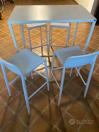 Realizzato completamente in acciaio zincato e successivamente riverniciato. La verniciatura è fatta con polvere poliestere che rende il prodotto impermeabile aglio agenti atmosferici +4 sgabelli.