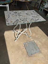 Tavolo in gres con piedi in ferro, misure 87cm x 60 cm. Decoro floreale.
