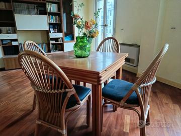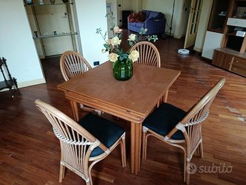 Tavolo allungabile in legno, completo di quattro sedie in vimini