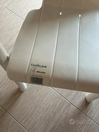 Tavolo rotondo in plastica bianca con foro per ombrellone, piu 4 sedie sempre in plastica biamca