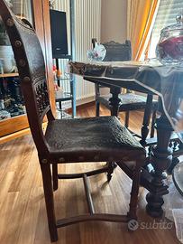 Sedie in legno massello (probabilmente noce o rovere scuro) con schienale e seduta in cuoio inciso e borchiato, altro dettaglio tipico dello stile neorinascimentale o rinascimentale spagnolo.